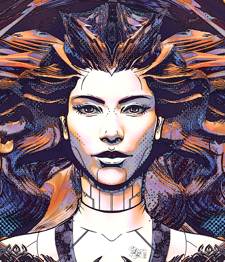 Fembot Closeup Portrait. Lion Mane Series Spinoff. 14 x 16 in. Giclee. March 2026. No AI. Setting up for Screen Printing series and runs.