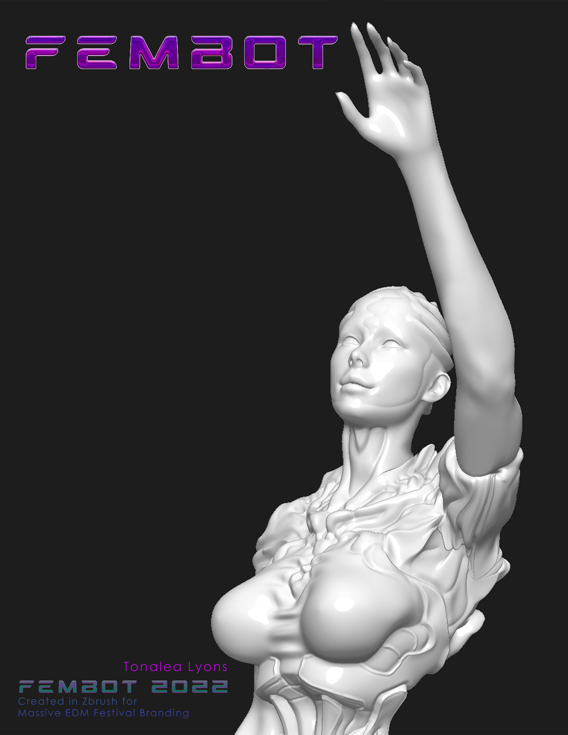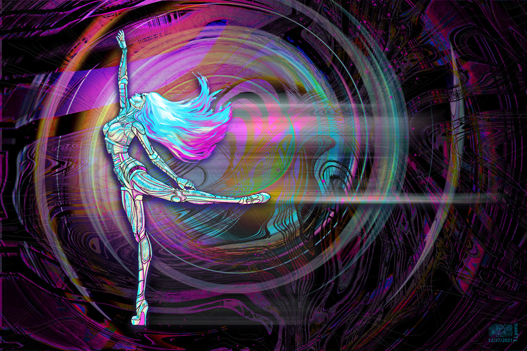 36 x 24 in. Digital Giclee. Fembot Dancer. 12/29/2021. From sketch, finished render using Adobe Photoshop.