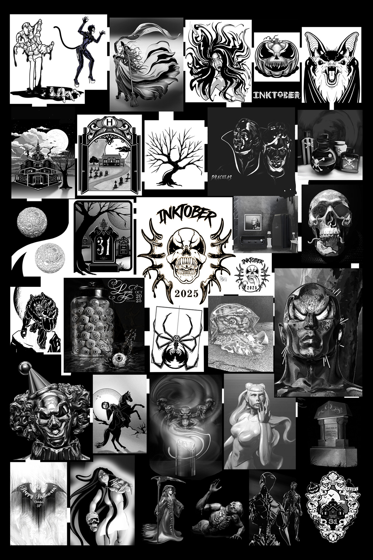 For 2025 Inktober, I decided to have my own list and create, using a halloween theme. I wanted to use digital renders to finish sketched artwork as well as using Zbrush to continue 3D character generation. I used Adobe to finish all designs. Each days creation was based on allocated time. Designs were created each day with no further refinement and rendering. No AI was involved at all. Each design will be subject{s} for future development, projects, IP's, series, versions, and character development and compilations.
